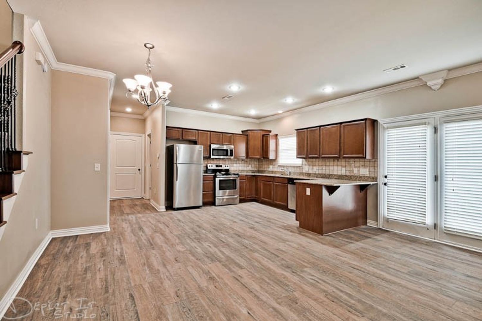 The kitchen is a chef’s dream, complete with modern appliances, ample cabinet storage, and a large island perfect for entertaining or casual meals. The adjoining dining area is ideal for family dinners or hosting guests.